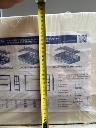 Cassetta per collettori componibile in plastica, universale per impianti a collettore. - Marca: Arteclima - Dimensioni: 63,5 x 29,5 cm - Materiale: Plastica - Tipologia: Collettore tradizionale, in barra o complanare Vendo cassetta d’ispezione Arteclima per impianti a collettori. ✅ Nuova e ancora imballata ✅ Misure 63,5 x 29,5 cm ✅ Ideale per impianti idraulici e riscaldamento a pavimento 💰 25€ prezzo realizzo 📍 Ritiro a mano Prezzo basso per vendita immediata, primo che viene la prende. Se vedete l’annuncio significa che è disponibile