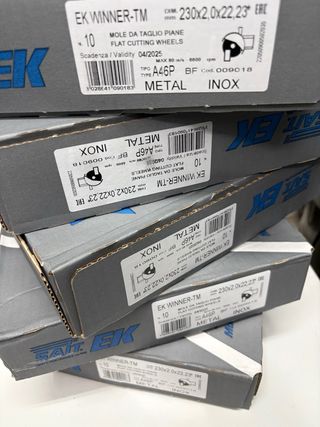 Set di dischi da taglio SAIT EK Winner per metallo. - Diametro: 230 mm - Spessore: 2,0 mm - Foro centrale: 22,23 mm - Tipo: A46P BF - Codice: 009018 Vendo 5 scatole di dischi da taglio SAIT EK Winner-TM per smerigliatrice angolare. Caratteristiche: • Diametro: 230 x 2.0 x 22.23 mm • Per metallo e acciaio inox • 10 dischi per scatola • Totale 50 dischi • Nuovi, mai usati • Qualità professionale Ideali per smerigliatrici da 230 mm. 💰 Prezzo 70 € per tutte le 5 scatole 📍 Consegna a mano zona Succivo Se vedete l’annuncio significa che è disponibile.