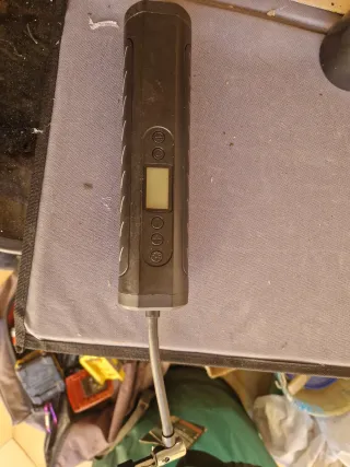 Compressore portatile di forma cilindrica. - Display digitale. - Pulsanti di controllo. - Tubo flessibile incluso.