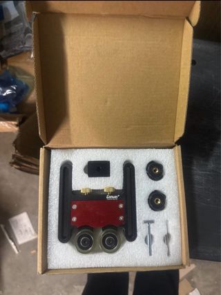 Rullo pressore per lavorazione legno. - Struttura in metallo nero. - Dettagli in rosso. - Due rotelle. - Manopole dorate. - Include accessori.