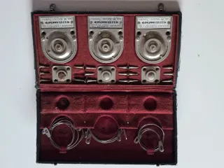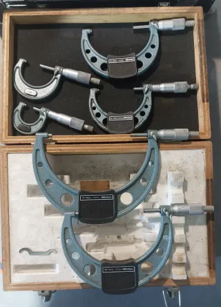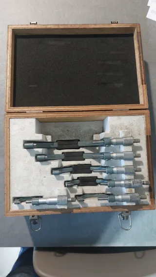 Set di micrometri in una valigetta di legno. Ideali per misurazioni precise. - Valigetta in legno con interno sagomato per riporre gli strumenti. - Set di micrometri con diverse misure. - Strumenti in metallo.