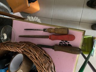 Set di tre utensili manuali con manici in legno e parti in metallo. - Un utensile con manico in legno scuro e punta piatta in metallo nero. - Un utensile con manico rosso e punta a sezione quadrata in metallo. - Un utensile con manico in legno e punta sottile in metallo.