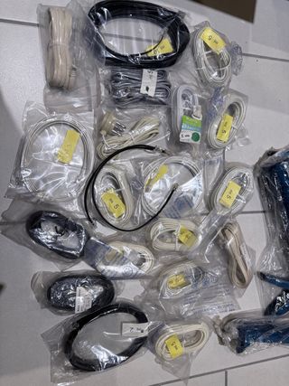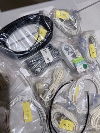 Vendo lotto composto da 21 cavi telefonici di varie lunghezze. - Cavi di colore bianco, beige e nero. - Lunghezze variabili (es. 5mt, 2mt, 10mt). - Ancora sigillati.