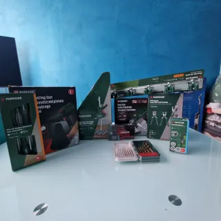 Set di attrezzi Parkside, nuovo e mai utilizzato. - Pistola sabbiatrice - Pistola termica - Pinze perforatrici - Set punte per trapano - cacciaviti E molto altro come potete vedere dalle foto Tutto nuovo + omaggio