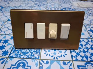 Vendo il seguente materiale elettrico Ticino serie magic: n°2 deviatori n°1 regolatore di intensità luminosa n°1 copriforo n°1 supporto 504 n°1 placca alluminio color bronzo Tutto perfettamente funzionante e in buono stato