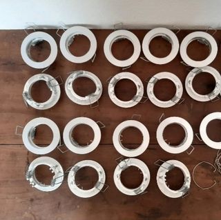21 porta faretti da incasso GU10 1 euro cadauno in metallo, prodotti italiani di buona qualità. universali, adatti per lampade alogene dicroiche, fluorescenti o a led usati Le ultime foto sono di esempio di montaggio, le lampadine non sono comprese, ma sono in vendita a parte, usate per 0,50 euro, nuove per 1 euro.