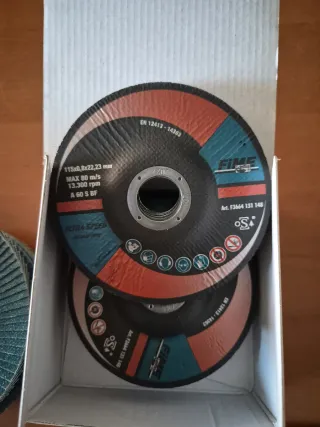 Set di dischi abrasivi lamellari e dischi da taglio x acciaio e ferro 11 dischi lamellari abrasivi grana 120 diametro 125x22,23 x acciaio e ferro 4 dischi lamellari abrasivi grana 80 diametro 125x22,23 25 dischi da taglio ultra speed x acciaio inox diametro 115x0,8x22,23 Il tutto nuovo per uso professionale in totale 40 pezzi a un prezzo eccezionale
