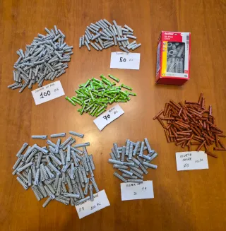 Vendita 500 pezzi di un assortimento di tasselli di varie marche e dimensioni. - Tasselli Fischer SX Plus: 100 pezzi, Ø6 - Tasselli Fischer SX: 50 pezzi, Ø6 - Tasselli Bifix: 70 pezzi, Ø6 - Tasselli Fischer SX Plus: 100 pezzi, Ø8 - Tasselli Fischer SX: 30 pezzi, Ø8 - Tasselli Wurth Shark: 100 pezzi, Ø6 - Tasselli fischer SX PLUS 50 PEZZI 10X50