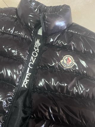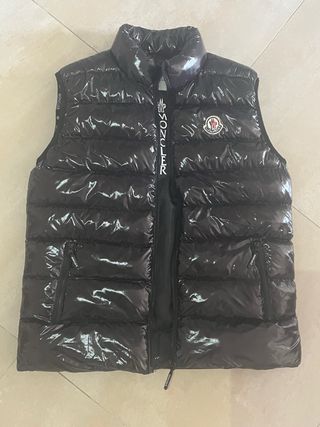 Gilet Moncler nero lucido, perfetto per aggiungere un tocco di stile. - Logo Moncler sul petto. - Zip frontale. - Tasche laterali con zip.