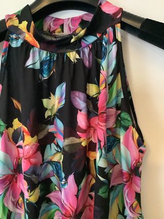 Canotta da donna con una bellissima fantasia floreale su sfondo nero. Il tessuto leggero e la stampa la rendono un capo unico. - Scollo rotondo. - Tessuto trasparente sulle spalle e sulla schiena. - Stampa floreale colorata.