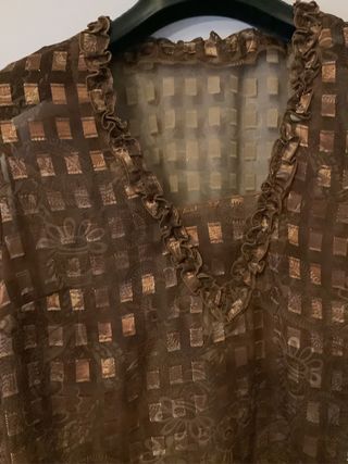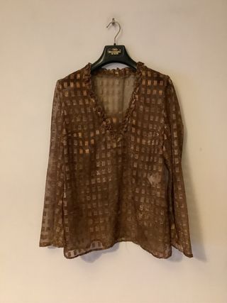 Camicia da donna con un motivo a scacchi. - Tessuto trasparente. - Maniche lunghe. - Collo con volant.