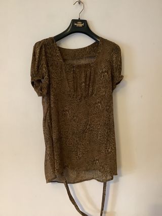 Elegante camicetta da donna con una fantasia animalier. - Tessuto leggero e trasparente. - Scollo a V. - Maniche corte a sbuffo. - Cintura in vita da annodare.