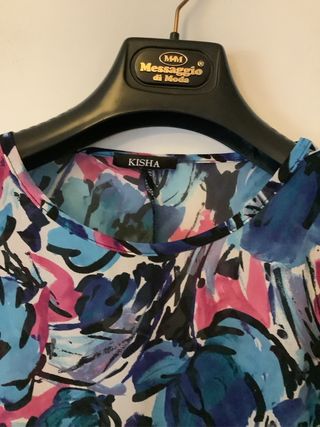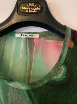 Maglia da donna Kenlen con una fantasia unica e colorata. - Maniche corte. - Girocollo. - Tessuto leggero e trasparente.