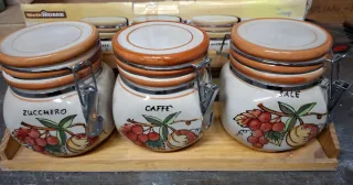 Set di tre barattoli in ceramica con decorazioni e scritte Zucchero, Caffè e Sale. Ideali per conservare alimenti in cucina. - Barattolo Zucchero - Barattolo Caffè - Barattolo Sale - Coperchi ermetici con guarnizione e chiusura a leva. Confezione originale danneggiata visibile in foto.