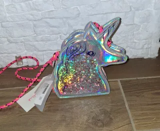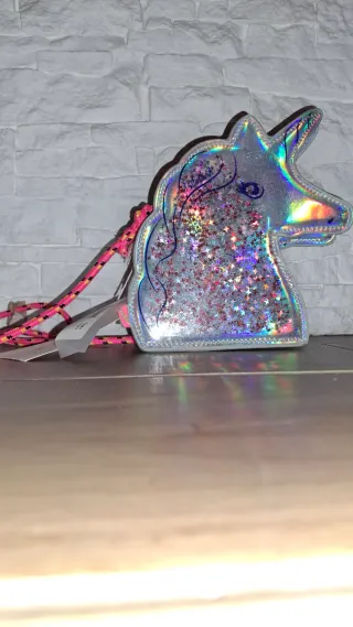 Simpatica borsetta a forma di unicorno con paillettes e glitter all'interno. La tracolla è rosa con dettagli neri. - Design a forma di unicorno. - Materiale iridescente. - Dettagli glitterati. - Tracolla inclusa.