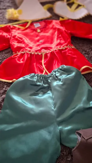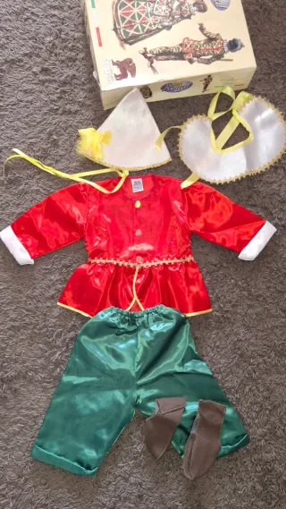 Costume da Pinocchio per bambini, completo di tutti gli accessori. - Casacca rossa con dettagli dorati e bianchi. - Pantaloni verdi. - Cappello bianco con fiocco giallo. - Bavaglino bianco con bordo dorato. - Scarpe marroni.