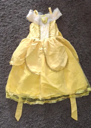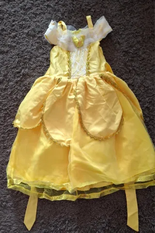 Bellissimo vestito da principessa color giallo, perfetto per feste o travestimenti. - Tessuto satinato lucido. - Dettagli in pizzo bianco sul corpetto. - Maniche a sbuffo e volant. - Gonna a più strati con bordi dorati.