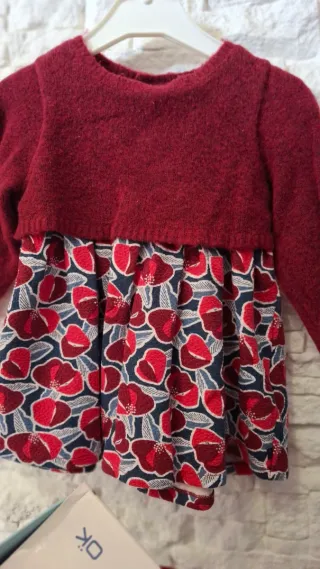 Vestito per bambina composto da maglioncino bordeaux e gonna con fantasia di fiori rossi e blu. - Maglioncino in lana. - Gonna con stampa floreale. - Maniche lunghe.