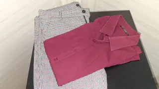 Set composto da camicia e pantaloni. - Camicia color bordeaux. - Pantaloni con fantasia a quadri piccoli.