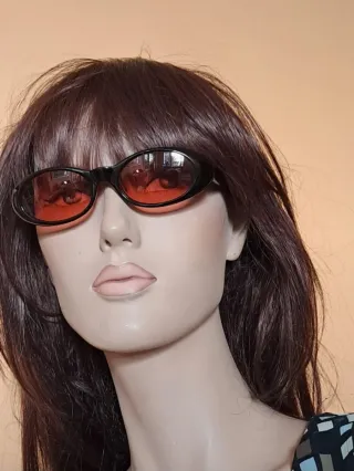 Occhiali da sole con montatura nera e lenti rosse. Provvisti di astuccio originale - Design ovale. - Stile moderno.