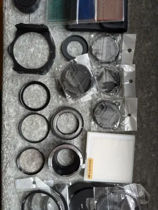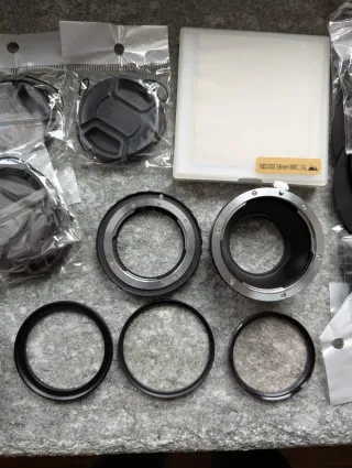 Kit di accessori per fotografia. - Filtro UV HMC Super Pro1 Digital 58mm - Filtro Gobe NDR1000 58mm - Filtro King 1A 52mm vintage - 3 filtri graduati nero Neewer - 3 filtri graduati colorati Neweer - 1 adattatore porta filtro - 1 adattatore EOS - Micro 4/3 - 1 adattatore Nikon - EOS - 1 anello 52-58mm - 1 anello 37-52mm - 1 tappo sensore 4/3 - 1 tappo obiettivo Micro 4/3 - 3 tappi 52mm - 2 tappi 58mm - 2 Rainsleeve per macchina fotografica - 1 strumento pulizia sensore e lente - 9 anelli di varie misure per adattatore porta filtro