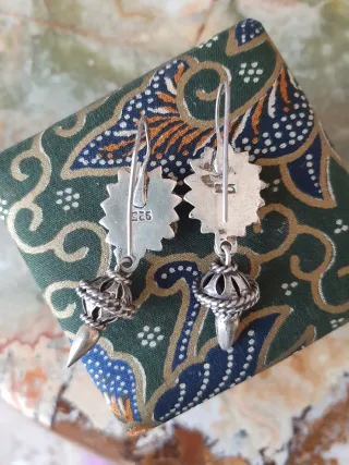 Eleganti orecchini pendenti in argento 925 e una pietra centrale di colore verde intenso. - Design unico con lavorazione a rilievo. - Pendente a forma di campanella con punta affusolata.