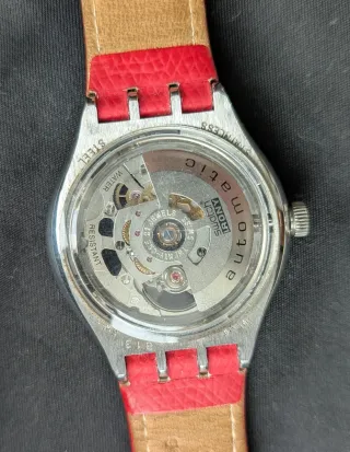 Orologio Swatch Irony del 2003, con movimento automatico e cassa in acciaio inossidabile. Il cinturino è in pelle rossa.