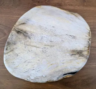 Piatto decorativo SOHO Balfern in Legno Fossile bianco. La sua forma irregolare e le venature naturali lo rendono un pezzo unico. Il legno fossile di cui è fatto questo piatto ha 20 milioni di anni. Valore commerciale 200 sterline.