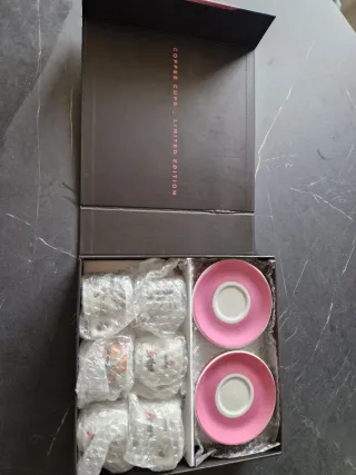 Elegante set di 6 tazzine da caffè e 6 piattini Segafredo Zanetti, edizione limitata per il Giro d'Italia. - Design esclusivo con dettagli rosa. - Perfetto per gli amanti del caffè e del ciclismo.