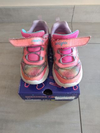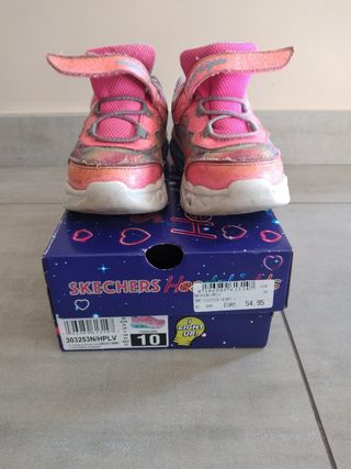 Scarpe da bambina marca Skechers, modello Ske Flutter Heart. - Colore rosa con dettagli iridescenti. - Chiusura con velcro. - Suola con luci che si attivano camminando. Numero 26