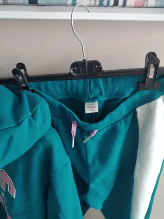 Tuta sportiva per bambina, composta da felpa con cappuccio e pantaloni. - Felpa verde con stampa VINTAGE COOL YOUNG sul davanti. - Pantaloni verdi con banda laterale bianca e stelline. - Coulisse rosa ai pantaloni.
