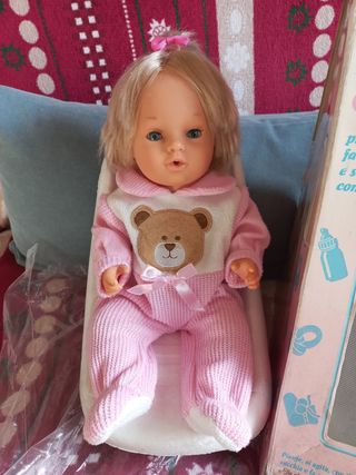 Bambola Furga Bimba Pappa. Molto molto Rara.Vintage, primi anni '90. Funzionante perfettamente. Ho il video che dimostra il funzionamento. Inserendo le pile, piange e muove braccia e gambe. Ottime condizioni. Il vano delle batterie ha delle macchie (visibili in foto), che ho provato a togliere ma non vanno via. La camicia è in pura seta, non è il vestito originale ma è comunque vintage. No perditempo! No affaristi! Tag: muñeca muñeco