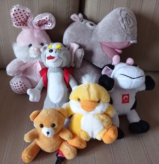 Lotto composto da 6 pupazzi peluche varie misure (da cm25/cm18/cm12) vari personaggi:Olga Ippopotamo Madagascar/Tom con zainetto/ Coniglietto rosa/ Pulcino giallo/ Mucca/ Orsetto con laccetto,tutti in ottime condizioni,adatti come regalo,per asilo,centro ricreativo, comunità,il prezzo è riferito all intero lotto.