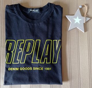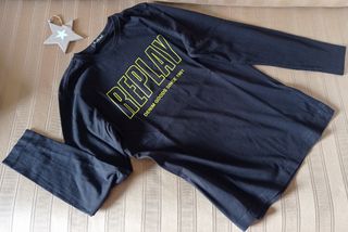 Maglietta Replay a maniche lunghe per ragazzo, taglia 12 anni - Colore nero. - Stampa Replay in giallo fluo. - Ottime condizioni.