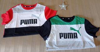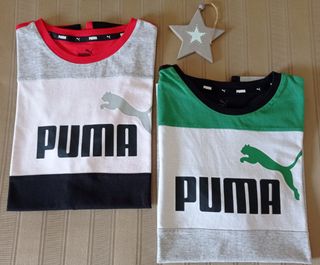 Vendo due magliette a maniche corte del marchio Puma, taglia 13/14 anni. Sono in ottime condizioni. - Colore grigio, bianco, rosso e nero. - Colore verde, bianco e grigio. - Stampa del logo Puma.