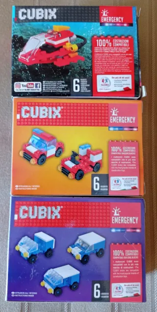 Set di 3 mini costruzioni Cubix a tema Emergency. - Un set include un elicottero. - Due set includono veicoli. - Ogni set è 2 in 1 o 3 in 1, permettendo diverse costruzioni.