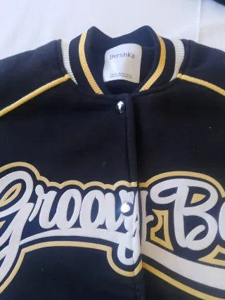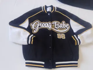 Giacca stile college Bershka con scritta Groovy Babe e numero 98. - Maniche bianche. - Bordi a costine con strisce gialle e bianche. - Chiusura con bottoni a pressione.