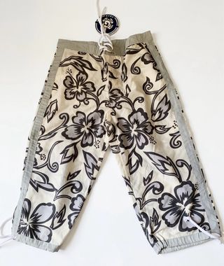 Bermuda Guga per bambino, taglia 10 anni. Fantasia floreale con dettagli a contrasto sui lati. - Tessuto leggero e confortevole. - Vita elasticizzata con laccetti. - Orlo regolabile con cordino.