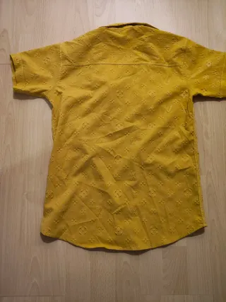 Camicetta a maniche corte con una fantasia tono su tono. - Colore: Giallo ocra - Fantasia: Monogrammi stilizzati - Scollo a V con colletto - Chiusura con bottoni frontali