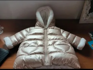 Caldo piumino per neonata, perfetto per le giornate più fredde. - Imbottitura interna per un calore extra. - Design con cappuccio foderato in morbida pelliccia. - Polsini e dettagli a forma di cuore in pelliccia bianca.