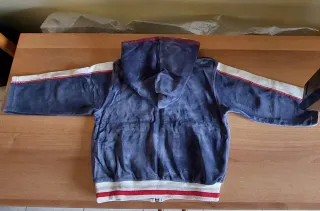 Caldo giubbotto con cappuccio per bambino. - Colore blu e verde. - Taglia 68 cm. - Presenta una A applicata sul petto.
