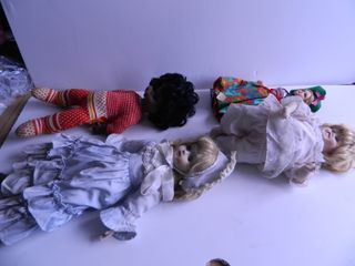 Lotto composto da 4 bambole vintage. - Una bambola con capelli neri e pigiama a pois rossi. - Una bambola con vestito azzurro e dettagli in pizzo. - Una bambola con capelli biondi e vestito bianco in pizzo. - Una bambola con vestito tradizionale colorato e cappello verde.