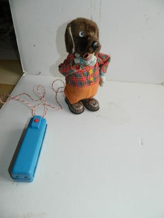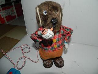 pupazzo semovente meccanico giocattolo di latta a molla SAN "Smoking Dog Mc Pooch" il cane cammina e fuma la pipa muovendo il braccio su e giù prodotto da SAN, Made in Japan funzionante a pile la pipa ha una lampadina rossa per simulare il fuoco che si accende quando vicino alla bocca perfettamente funzionante (leggero difetto all'occhio sx)