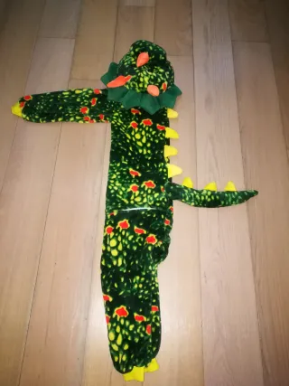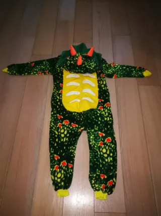 Morbido pigiama a tema dinosauro triceratopo, ideale per travestimenti o per stare comodi in casa, taglia 8/10 anni, lunghezza 120 cm, apertura a cerniera frontale e dietro. Molto caldo e ottimo per carnevale. - Design a dinosauro triceratopo. - Colore verde con macchie gialle e rosse. - Dettagli come corna e cresta sul cappuccio. - Chiusura frontale.