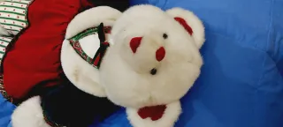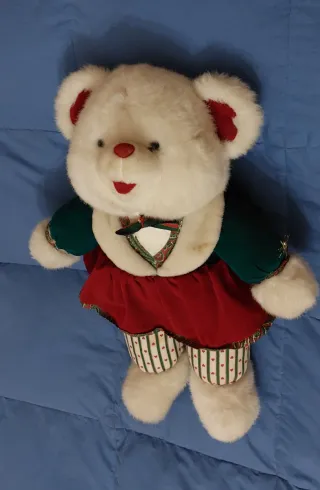 Peluche vintage a tema natalizio, un simpatico orsetto Kmart. - Orsetto bianco con dettagli rossi. - Indossa un vestito rosso e blu con bordi decorati.