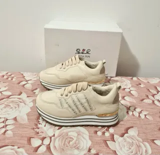 Scarpe Patrizia Pepe originali in vera pelle, taglia 34. - Dettagli glitter sul tallone. - Inserti con logo Patrizia Pepe sui lati. - Suola platform a righe.