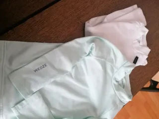 Maglietta a manica lunga per bambina, marca WEDZE. - Colore verde acqua. - Logo WEDZE stampato sulla manica. Pantaloni Monnalisa. Quelli in ciniglia sono un po' consumati sulle ginocchia