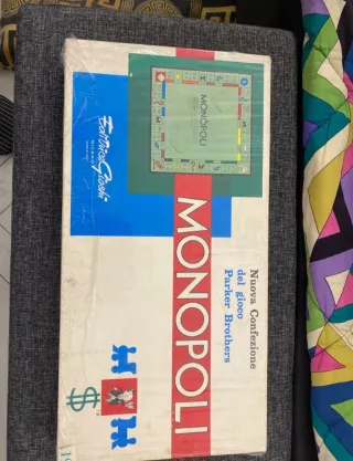 Classico gioco da tavolo Monopoli, edizione italiana. Ancora sigillato e incellophanato, oggetto raro, per collezionisti. - Edizione Nuova Confezione di Parker Brothers. - Prodotto da Editrice Giochi, Milano. - Presenta il logo Monopoli e Via!. - Include elementi grafici come il simbolo del dollaro ($) e personaggi stilizzati.
