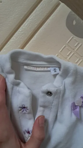 Tutina Minibanda per neonata, in morbido tessuto bianco. - Dettagli con fiorellini viola. - Fiocco viola sul petto. - Bordi delle maniche e dei piedini con fantasia floreale. - Chiusura con bottoncini.
