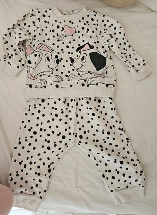 Comodo set composto da felpa e pantaloni per neonata, con stampa dei personaggi Disney dei 101 Dalmata. Taglia 6/9mesi 68cm Cotone Garzato Articolo presente su altri siti online - Felpa con girocollo e stampa. - Pantaloni con elastico in vita e polsini.